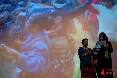Ine Febrianti dan Alenta Baun membacakan puisi tentang lingkungan sebagai pembuka pagelaran South to South Film Festival di Goethe Institute, Jakarta, Rabu, 22/02. FOTO : AHMAD FAUZAN