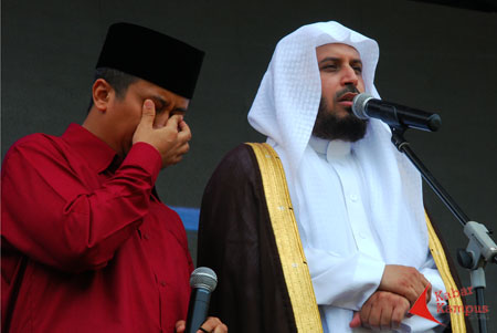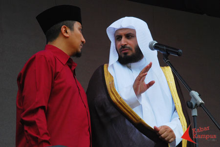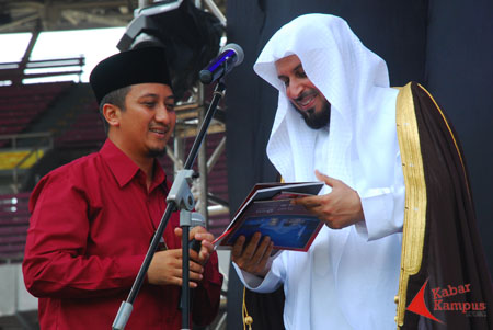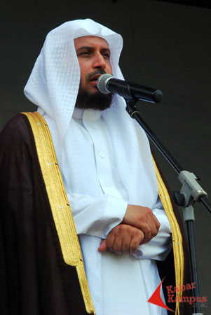 Syaikh Al- Ghamidi, Imam Masjidil Haram Makkah dan Masjid Nabawi Madinah mengumandangkan ayat Al-Aquran di Senayan Jakarta, Jumat, (30/03/2013). Dalam kesempatan itu, ia melantunkan surat An – Naba’ di hadapan lebih dari seribu wisudawan “4 One Day One Ayat”.