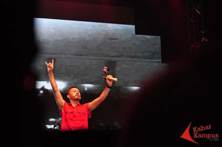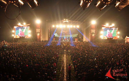 Di bawah panggung, penonton terus berteriak, bernyanyi bersama. Mereka berdesakan, berhimpit, ingin mendekat. Tak henti mengalunkan lagu.
