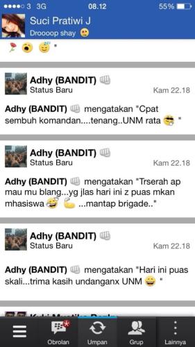 Sebelumnya ia mengatakan ; “Cpat sembuh Komandan. Tenang.. UNM Rata,..” katanya. Selain itu anggota Brimob ini juga mengatakan puas dengan penyerangan di kampus UNM, “Hari ini puas skali… Terima kasih undanganx UNM J.”