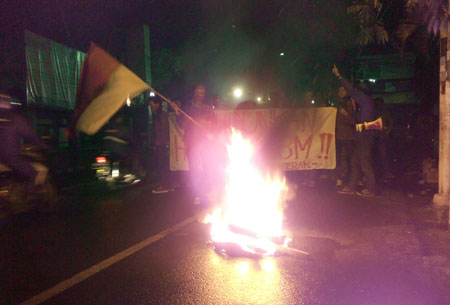 Sepanjang memblokir jalan, mahasiswa membakar ban dan melakukan orasi secara bergantian. Selama aksi berlangsung tidak satu pun terlihat polisi berseragam di lokasi demonstrasi.[]