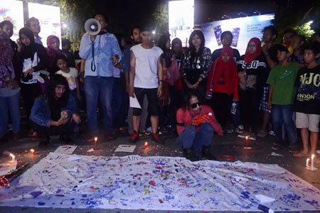 Menjelang pergantian tahun baru, para pemuda Surabaya bersama Komunitas Surabaya Muda menggelar aksi simpatik untuk korban pesawat AirAsia QZ8501 di lokasi car free night Gubernur Suryo, Surabaya, Rabu malam, (31/12/2014). Dalam kegiatan yang mengusung tema “Duka air asia, duka kita semua” ini para pemuda mengajak para pengunjung car free night untuk peduli terhadap permasalahan yg terjadi.