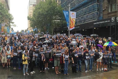 Dipimpin oleh Duta Besar Perancis, Christophe Lecourtier yang memegang poster bertuliskan “Je Suis Charlie” dan “Kebebasan” , berjalan bersama menuju Martin Place, sekitar 50 meter dari Cafe Lindt.