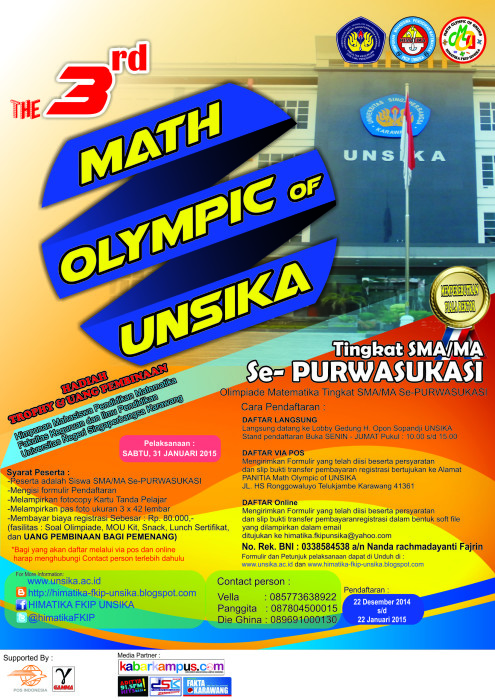 Himpunan Mahasiswa Pendidikan Matematika Universitas Negeri Singaperbangsa Karawang (Himatika FKIP Unsika) menggelar The 3rd Math Olympic of Unsika (MOU). Kegiatan ini merupakan Olimpiade Matematika tingkat SMA/MA wilayah IV Jawa Barat (Purwakarta, Subang, Karawang, dan Bekasi).