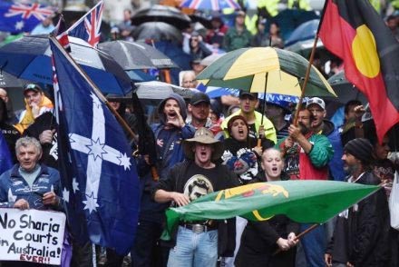 Demonstran kelompok Reclaim Australia berunjuk rasa di Sydney meski diwarnai hujan lebat. FOTO : AAP