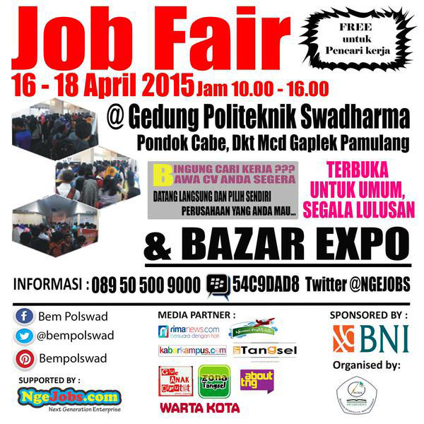 Dalam rangka untuk mengurangi pengangguran di Indonesia khususnya di daerah Tangerang Selatan, Badan Eksekutif Mahasiswa Komivi IV Bidang Humas dan Penerbitan Politeknik Swadharma menggelar acara JOB FAIR 2015. Acara ini akan dilaksanakan pada hari Kamis hingga Sabtu dari tanggal 16 – 18 April 2015 di Gedung Politeknik Swadharma.