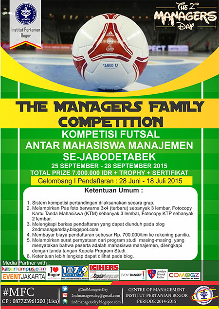 Centre Of Management Institut Pertanian Bogor mempersembahkan sebuah acara THE MANAGERS FAMILY COMPETITION yang merupakan salah satu rangkaian acara dari THE 2nd MANAGERS DAY. Kegiatan ini akan dilaksanakan pada 25 – 28 September 2015 di kampus IPB Dramaga, Bogor (Gymnasium IPB).