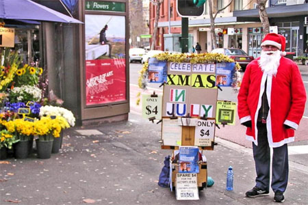 Natal di bulan Juli, secara meningkat, digunakan untuk tujuan komersil, seperti tampilan pohon di Pitt Street, Sydney, pada tahun ini. Terlepas dari dekorasi yang megah, kopi dan popcorn panas juga disajikan gratis untuk memotivasi warga sekitar agar datang berbelanja. []