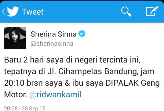 Kejadian pemalakan itu ia ungkapkan melalui akun twitternya @sherinasinna. “Baru 2 hari saya di negeri tercinta ini, tepatnya di Jl. Cihampelas Bandung, jam 20:10 brsn saya & ibu saya DIPALAK Geng Motor. @ridwankamil,” tulis Sherina.