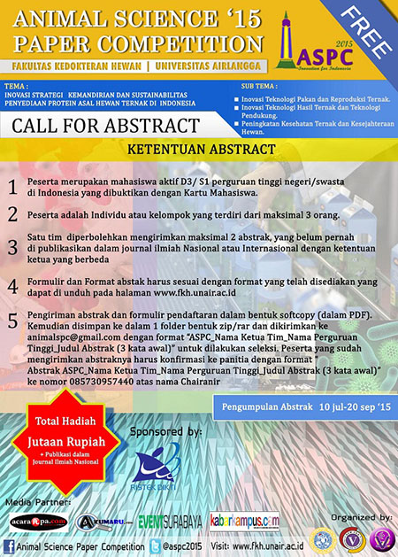 Fakultas Kedokteran Hewan Universitas Airlangga mengadakan serangkaian acara Animal Science Paper Competition 2015. Acara ini ditujukan untu mahasiswa aktif S1/D3 se-Indonesia yang memiliki penelitian yang belum terpublikasi secara ilmiah.