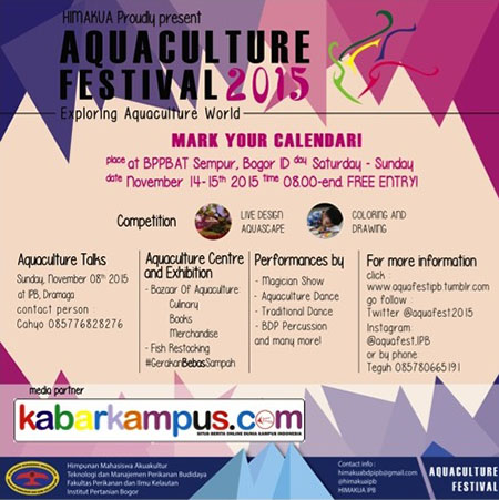 HIMAKUA IPB kembali mempersembahkan AQUAFEST 2015. Acara tahun keempat ini mengusung tema ”Exploring Aquaculture World”. Tema ini dipilih karena AQUAFEST 2015 ingin memperkenalkan dan meningkatkan ketertarikan masyarakat umum khususnya masyarakat kota Bogor terhadap akuakultur.