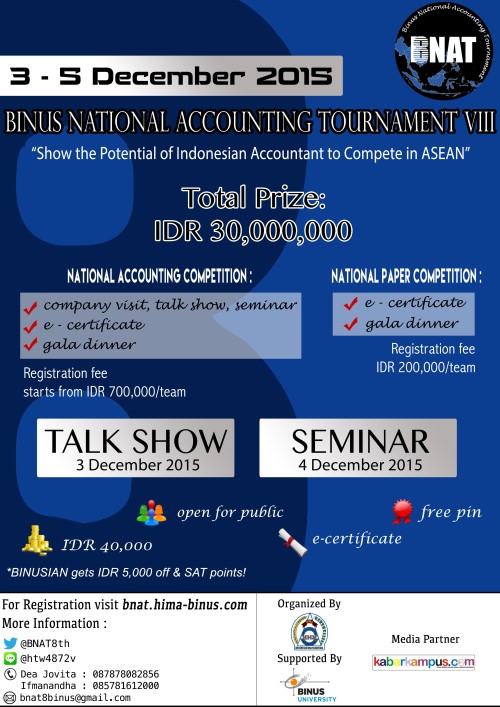 HIMA (Himpunan Mahasiswa Akuntansi) BINUS University mempersembahkan BNAT 8 (Binus National Accounting Tournament 8). Acara kompetisi Akutansi berskala nasional ini mengusung tema “Show the Potential of Indonesian Accountant to Compete in ASEAN”.
