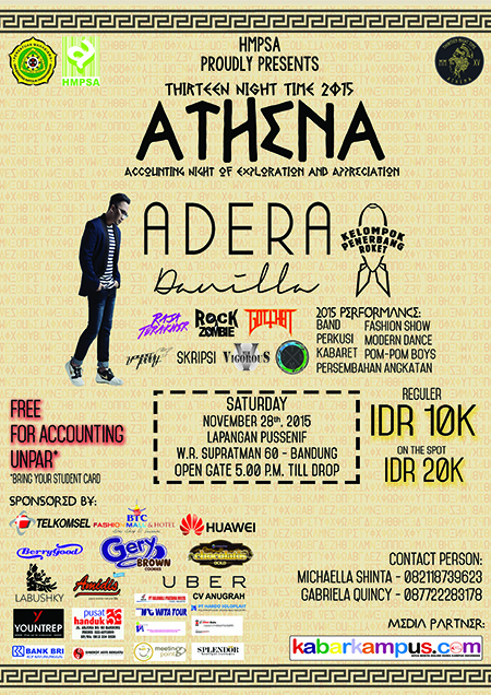 Mahasiswa Akutansi Universitas Parahyangan (Unpar) mempersembahkan Thirteen Night Time 2015. Acara malam Malam Kebersamaan Akutansi tahun 2015 akan digelar pada 28 November 2015 di Lapangan Pussenif, Jalan W.R. Supratman No. 60, Bandung.