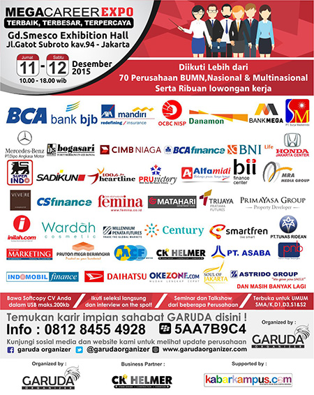 Setelah kembali sukses dengan event perekrutan pada Mega Career Expo series di GBK 6-7 Oktober 2015, kini Garuda Organizer kembali menggelar Mega Career Expo. Kali ini Mega Career Expo mengahadirkan ratusan perusahaan baik nasional maupun multinsional.