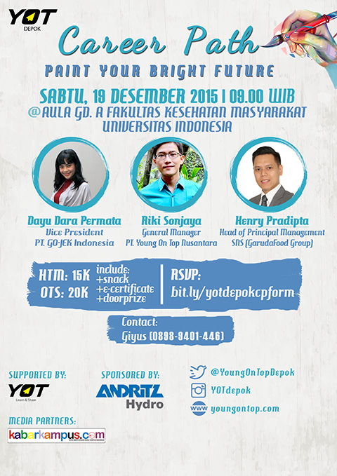 Young On Top Depok menggelar acara seminar dan workshop Career Path 2015. Acara ini membahas seputar karir mulai dari pembuatan CV bertaraf internasional hingga pengembangan karir. Seminar dan workshop akan digelar di Aula Gedung A Fakultas Kesehatan Masyarakat Universitas Indonesia, Depok pada tanggal 19 Desember 2015.