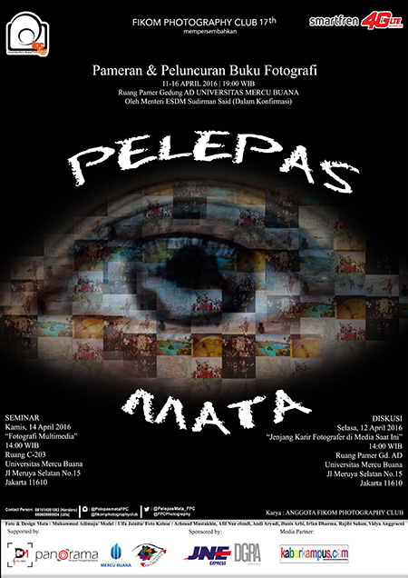 Fikom Photography Club 17th Universitas Mercu Buana mempersembahkan Pameran dan Peluncuran Buku Fotografi berjudul “Pelepas Mata”. Peluncuran dan pameran ini digelar apda 11 -16 April 2016 pukul 19.00 WIB di Ruang Pamer Gedung AD Universitas Mercu Buana. Peluncuran buku dan pameran ini rencananya akan dihadiri oleh Sudirman Said, Menteri ESDM.