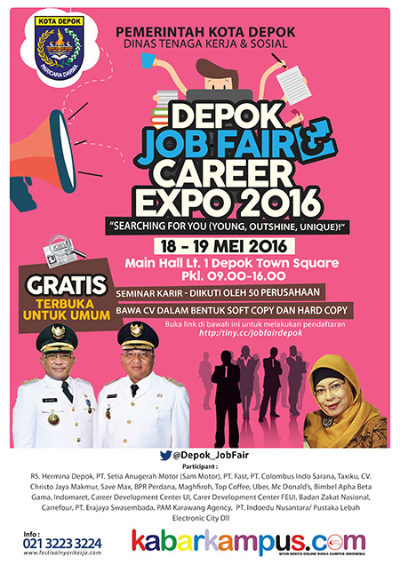 Dinas Tenaga Kerja dan Sosial Kota Depok kembali menggelar pameran bursa kerja atau job fair 2016. Acara yang bertajuk “Depok Job Fair & Career Expo 2016” ini akan digelar selama dua hari yaitu Rabu dan Kamis pada tanggal 18-19 Mei 2016 di Main Hall, Lantai 1, Depok Townsquare.