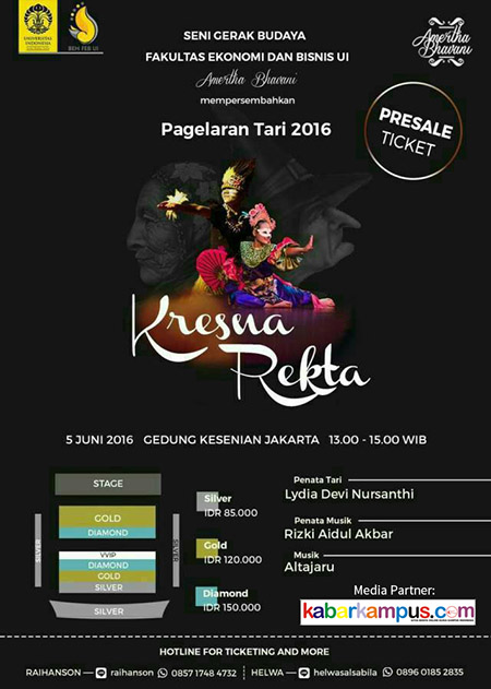 UKF Seni Gerak Budaya FEB UI mempersembahkan Pagelaran Tari “Kresna Rekta”. Acara ini merupakan pagelaran untuk melepas keberangkatan penari dan pemusik ke luar negeri untuk melakukan Misi Budaya.