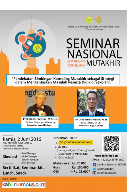 Program Studi Bimbingan dan Konseling Universitas Negeri Jakarta mempersembahkan seminar Bimbingan Konseling dengan Tema : “Pendekatan Bimbingan Konseling Mutakhir Sebagai Strategi Dalam Mengentaskan Masalah Peserta Didik di Sekolah”. Seminar ini siap digelar pada hari Kamis 2 Juni 2016, bertempat di Aula Maftuhah Yusuf, lantai 2 Gedung Dewi Sartika, kampus A, Universitas Negeri Jakarta.