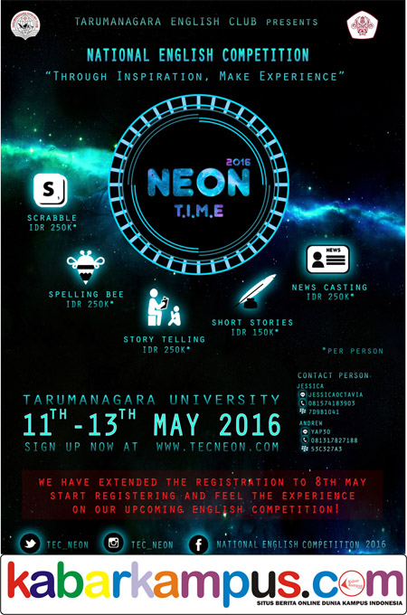 Tarumanagara English Club (TEC) hereby presents National English Competition 2016 (shortened to NEC)! This event will begin between 11-13thMay 2016 and take place in Tarumanagara Univesity, Jakarta.