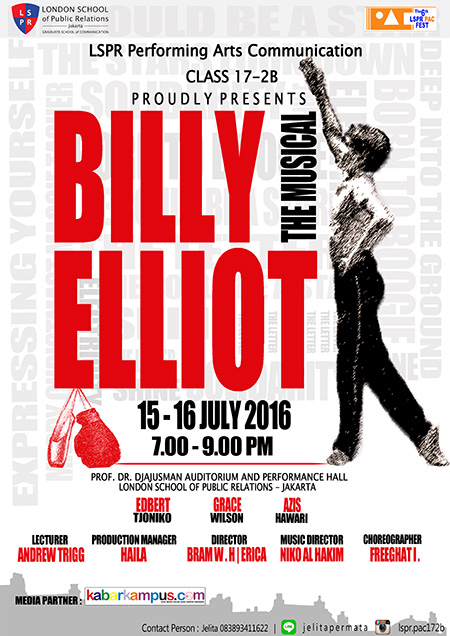 LSPR Performing Arts Communication Class 17-2B mempersembahkan “Billy Elliot The Musical”. Kegiatan ini akan diselenggarakan di Prof. Dr. Djajusman Auditorium and Performance Hall, Campus B, London School of Public Relations – Jakarta, pada hari Jumat, 15 Juli dan Sabtu, 16 Juli 2016 pada pukul 19.00 WIB.