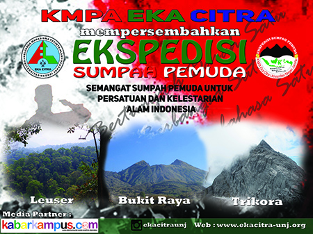 KMPA Eka Citra, Universitas Negeri Jakarta (UNJ) siap menggelar Ekspedisi Sumpah Pemuda. Kegiatan yang digelar untuk memperingati Hari Sumpah Pemuda ini diselenggarakan dengan misi mengibarkan Sang Saka Merah Putih di tiga Puncak Gunung di tiga pulau terbesar Indonesia.