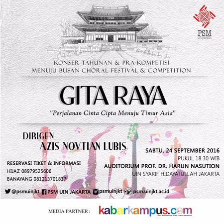 Paduan Suara Mahasiswa Universitas Islam Negeri Jakarta mempersembahkan Konser GITA RAYA “Perjalanan Cinta Cipta Menuju Timur Asia”. Konser ini merupakan Sebuah Konser Tahunan dan Pra Kompetisi menuju Busan Choral Festival & Competition.