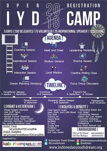 Indonesian Youth Dream (IYD) Foundation dengan bangga mempersembahkan rangkaian acara IYDCamp 2016. IYDCamp adalah sebuah event kepemudaan skala nasional yang mengajak anak-anak muda potensial dari seluruh Indonesia untuk bertemu, saling menginspirasi, berkolaborasi, mempersiapkan diri untuk berani bermimpi besar dan bertekad kuat untuk mewujudkan semua mimpinya demi Indonesia yang lebih baik.