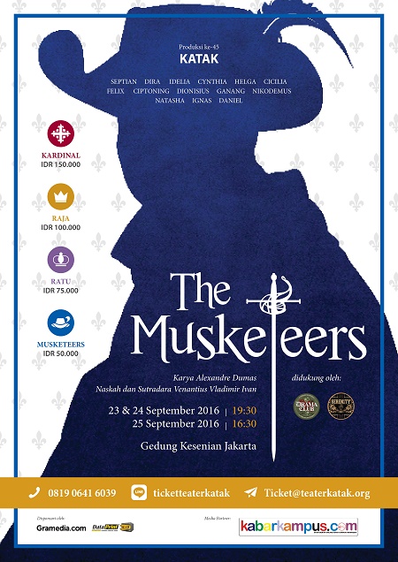 Pementasan teater The Musketeers digelar pada tanggal 23,24,25 September 2016 di Gedung Kesenian Jakarta.