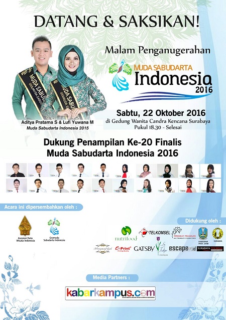 Asosiasi Duta Wisata Indonesia dan Gramuda Sabudarta Indonesia mempersembahkan Malam Penganugerahan Muda Sabudarta Indonesia 2016. Kegiatan ini akan diselenggarakan pada hari Sabtu, 22 Oktober 2016 di Gedung Wanita Candra Kencana Surabaya, Jawa Timur pukul 18.30 WIB – selesai