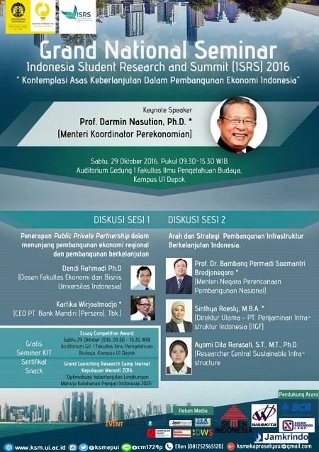 “Kontemplasi Asas Keberlanjutan dalam Pembangunan Ekonomi Indonesia”. Seminar akan diadakan pada hari Sabtu, 29 Oktober 2016, Pukul 09.30-15.30 WIB di Auditorim Gedung 1 Fakultas Ilmu Budaya, Kampus UI Depok.