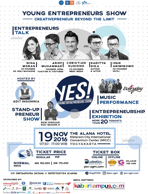 YES! 2016 kali ini hadir dengan rangkaian acara: Entrepreneurs Talk, Acoustic Performance, Stand-Up Preneur Show, dan Entrepreneurship Exhibition. Speakers YES! di tahun ke-4 ini pun tak kalah menarik dibanding tahun-tahun sebelumnya yaitu Ivan Ariwibowo (Co-Founder Voyej), Christian Sugiono (Co-Founder MBDC Media), Arief Muhammad (Youtuber and Founder of Oppai Yakitori), Raditya Dika (Author), dan Nina Moran (Co-Founder of Aprilis.Co)