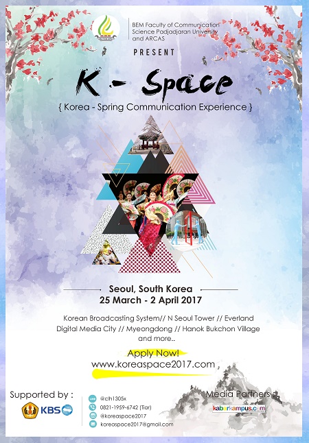 BEM Fakultas Ilmu Komunikasi Universitas Padjadjaran bekerjasama dengan Arcas menyelenggarakan kegiatan study abroad ke Korea, K-Space (Korea-Spring Communication Experience). Dalam kegiatan ini, peserta akan diajak belajar dan memahami perkembangan media massa dan budaya di Korea selama 8 hari mulai dari 25 Maret -2 April 2017.