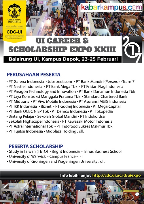Career Development Center Universitas Indonesia (CDC UI), pusat pengembangan karir dan kualitas sumberdaya manusia di bawah Direktorat Hubungan Alumni Universitas Indonesia mengadakan pameran karir dan beasiswa UI Career & Scholarship Expo XXIII 2017.