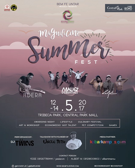 ECONOWEEKS – THE FESTIVAL are an annual event which is held by Badan Eksekutif Mahasiswa Fakultas Ekonomi Universitas Tarumanagara (BEM FE UNTAR). We create this event based on the rapid development of art & music industry, as well as the entrepreneurship among young people. The purpose of this event is to create an opportunity for them, young people, to develop more in music industry and also to contribute positively to the culture, art & music industry, also the emergence along with the growth of the local brands. Econoweeks itself are a platform to accommodate the economics students at Tarumanagara University with high academic achivement by giving them an appreciation in our Awarding Night on the Main Event of Econoweeks 2017.