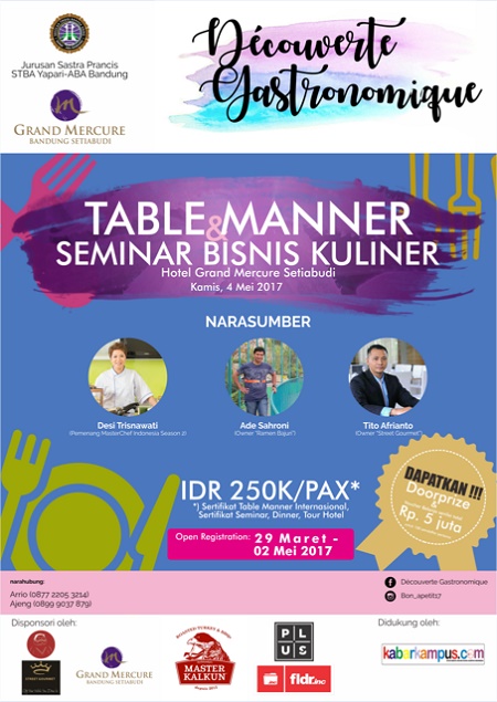 Oleh karena itu, mahasiswa jurusan Santra Prancis STBA YAPARI – ABA Bandung mempersembahkan acara “Table Manner & Seminar Bisnis Kuliner”. Dalam acara ini peserta akan dikenalkan dengan Tourisme, hotellerie et restauration.