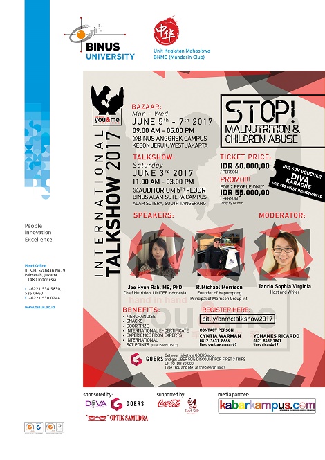 Bina Nusantara (Binus) Mandarin Club mempersembahkan International Talkshow dengan tema “Hand in Hand, You &Me” di Auditorium Binus Kampus Alam Sutera, Tangerang pada hari Sabtu 3 Juni 2017. Talkshow kali ini akan mengangkat topik : “Malnutrition and Children Abuse”.