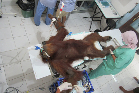 Dari hasil pemeriksaan x-ray di Pusat Karantina Orangutan, ditemukan peluru senapan angin sebanyak 74 butir yang tersebar di seluruh badan. Kondisi orangutan masih belum stabil sehingga masih akan berada di kandang treatment untuk mendapatkan perawatan intensive 24 jam.
