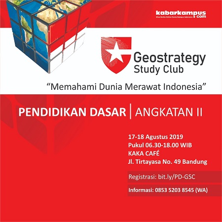Geostrategy Study Club kembali membuka kesempatan bagi anak muda yang kritis dan progresif (S1, S2 maupun S3) untuk mengikuti Pendidikan Dasar Anggota angkatan ke-2 yang akan diselenggarakan pada :