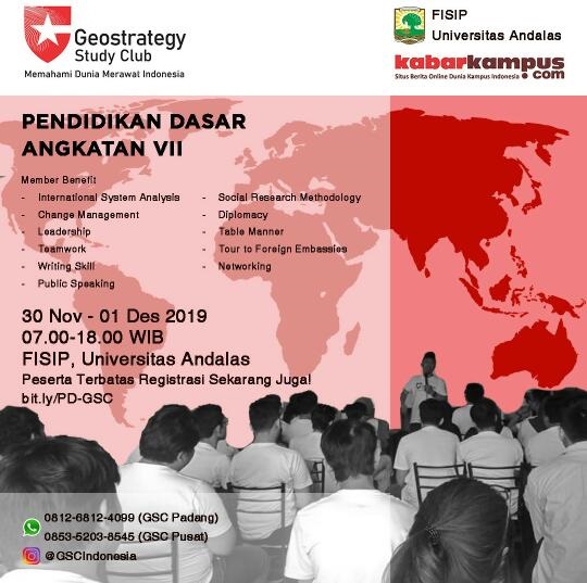 Geostrategy Study Club bekerja sama dengan FISIP Univetsitas Andalas, kembali membuka kesempatan bagi anak muda yang kritis dan progresif (S1, S2 maupun S3) untuk mengikuti Pendidikan Dasar GSC angkatan ke-7 yang akan diselenggarakan pada: