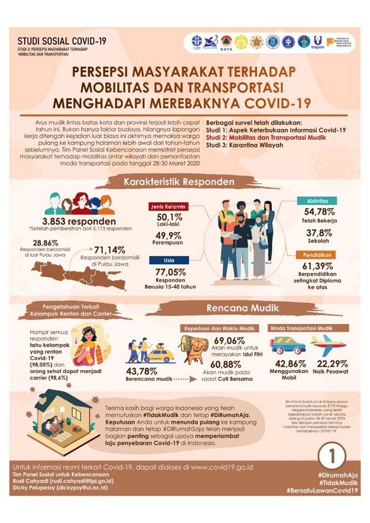 Tim Panel Sosial untuk Kebencanaan merupakan kolaborasi para peneliti kebencanaan dari Lembaga Ilmu Pengetahuan Indonesia (LIPI), UI, Universitas Gadjah Mada (UGM), Institut Teknologi Bandung (ITB), Institut Pertanian Bogor (IPB), Politeknik Statistika Sekolah Tinggi Ilmu Statistik, U-INSPIRE, Jurnalis Bencana dan Krisis Indonesia serta didukung oleh Kementerian Riset dan Teknologi/Badan Riset dan Inovasi Nasional (BRIN) dan Badan Nasional Penanggulangan Bencana (BNPB). Survei Studi Sosial COVID-19 mengenai Mobilitas dan Transportasi melibatkan masyarakat umum sejumlah 3.853 responden dengan rentang usia 15–60 tahun ke atas.()