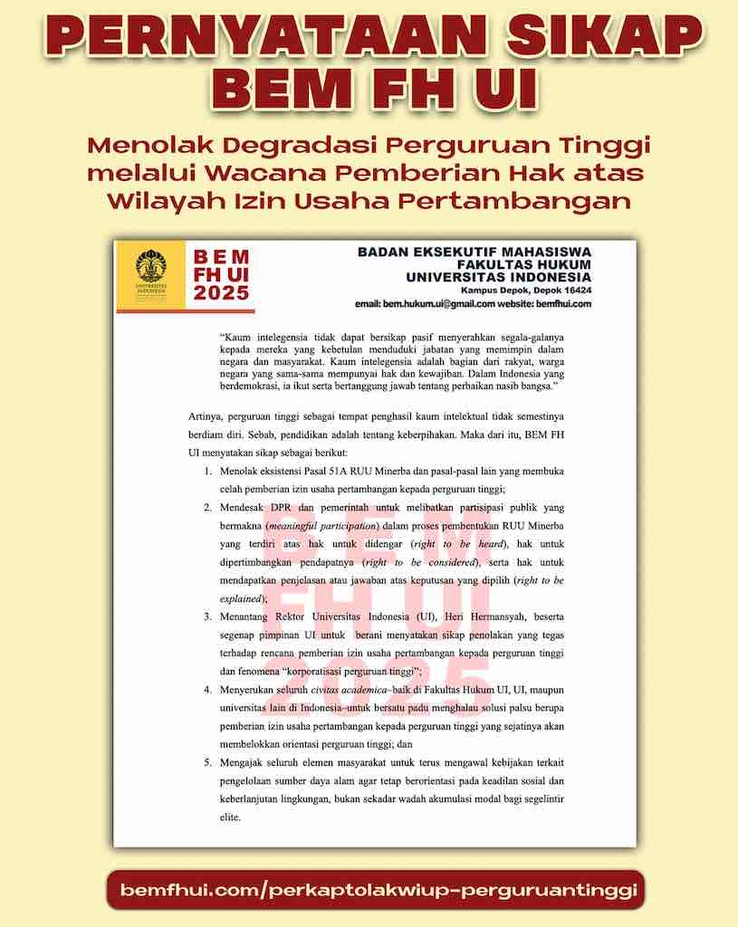 “Tidak ada urgensi yang jelas mengapa cara fast-track legislation digunakan demi memperlancar jalannya RUU Minerba menuju tahapan pengundangan,” tulis pernyataan lebih lanjut. Oleh sebab itu, BEM FH UI melakukan pernyataan sikap sebagai berikut: