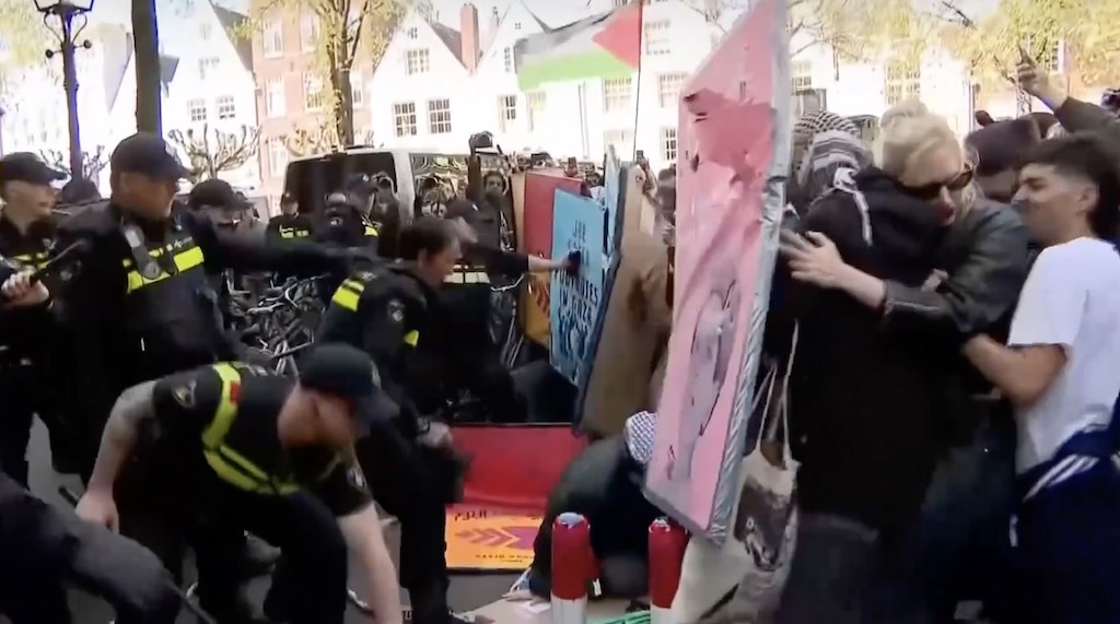Di Amsterdam, Polisi Belanda menggunakan tongkat terhadap pengunjuk rasa pro-Palestina di Universitas Amsterdam (15/04/2025). Para demonstran menduduki gedung kampus, menuntut universitas tersebut memutuskan hubungan dengan lembaga-lembaga Israel atas perang di Gaza.