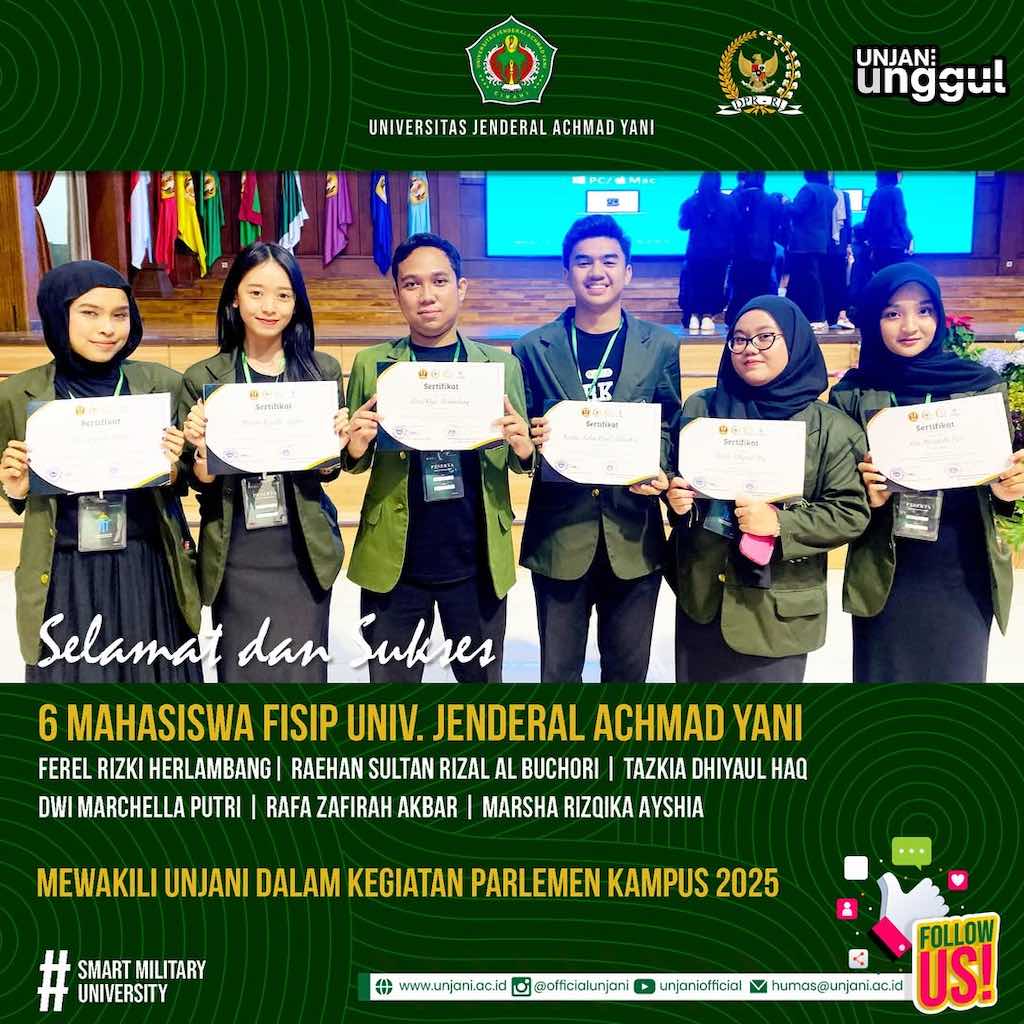 CIMAHI, KabarKampus – Selamat dan apresiasi setinggi-tingginya kepada enam mahasiswa Fakultas Ilmu Sosial dan Ilmu Politik (FISIP) Universitas Jenderal Achmad Yani (UNJANI) yang telah terpilih untuk mewakili kampus dalam ajang Parlemen Kampus 2025. Kegiatan bergengsi ini diselenggarakan oleh Sekretariat Jenderal DPR RI dan berlangsung pada 24 April 2025, dengan tujuan memberikan pemahaman langsung mengenai dinamika dunia legislatif kepada generasi muda.
