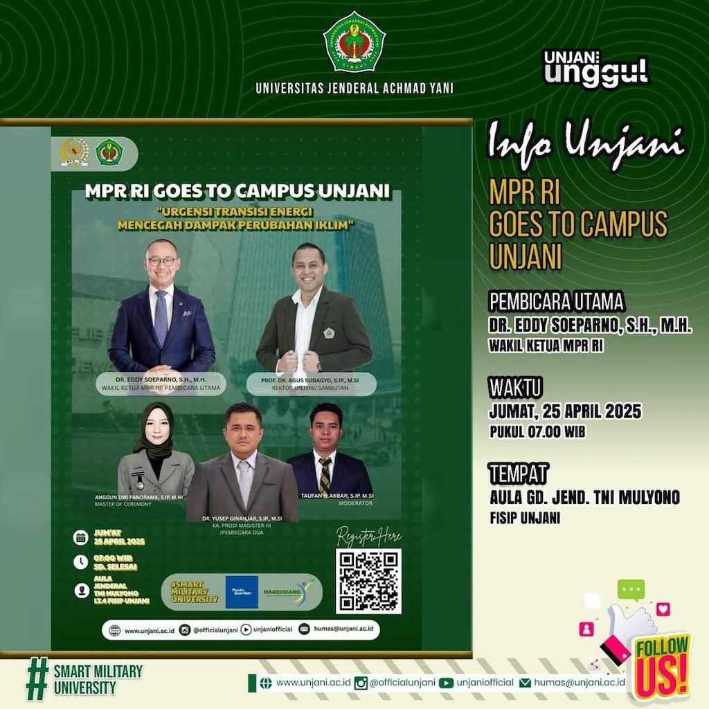 CIMAHI, KabarKampus – Universitas Jenderal Achmad Yani (UNJANI) kembali menjadi tuan rumah kegiatan nasional bergengsi bertajuk “MPR RI Goes to Campus”, yang kali ini mengangkat tema Urgensi Transisi Energi Mencegah Dampak Perubahan Iklim. Kegiatan ini digelar pada 25 April 2025 dan menghadirkan sejumlah tokoh penting yang memberikan pandangan strategis seputar isu keberlanjutan energi di Indonesia.
