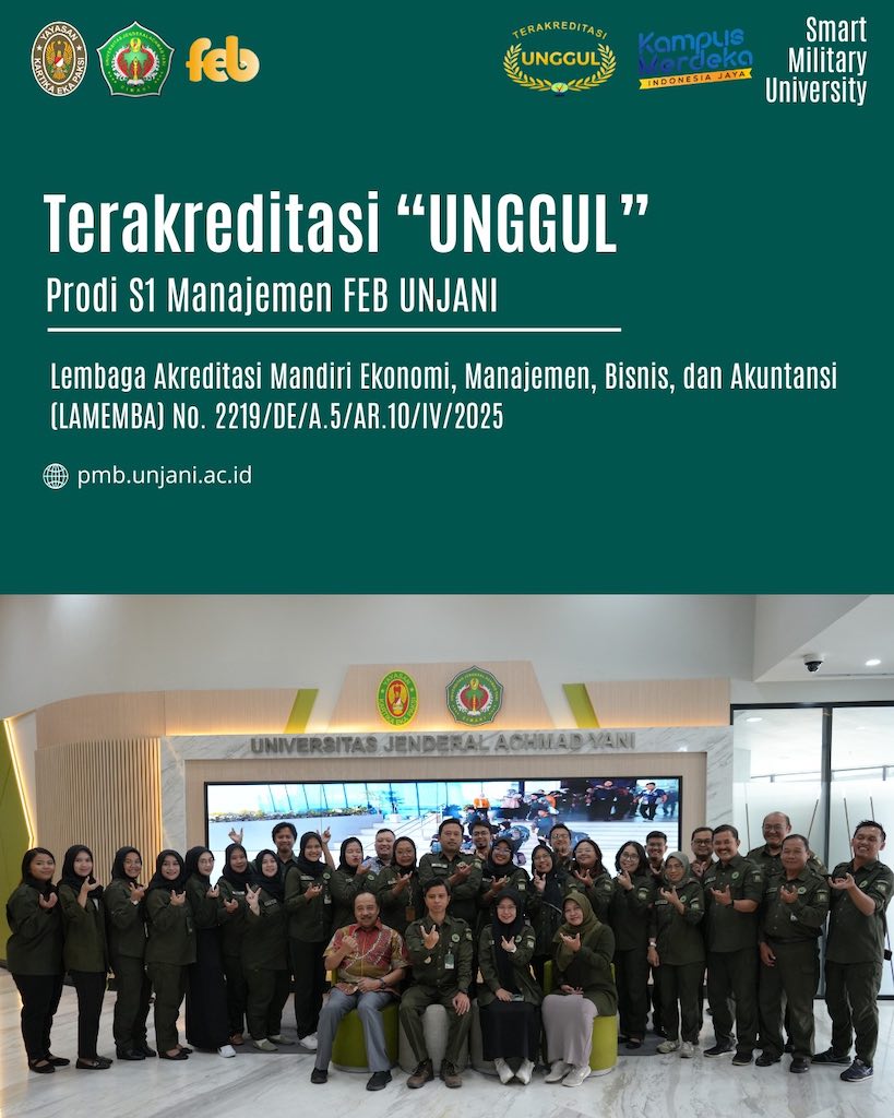 CIMAHI, KabarKampus – Selamat dan sukses untuk Program Studi Manajemen S1, Fakultas Ekonomi dan Bisnis, Universitas Jenderal Achmad Yani (UNJANI) atas capaian akreditasi peringkat UNGGUL dari Lembaga Akreditasi Mandiri Ekonomi, Manajemen, Bisnis, dan Akuntansi (LAMEMBA). Keputusan ini tertuang dalam Surat Keputusan LAMEMBA No. 2219/DE/A.5/AR.10/IV/2025 yang ditetapkan di Jakarta pada tanggal 21 April 2025.