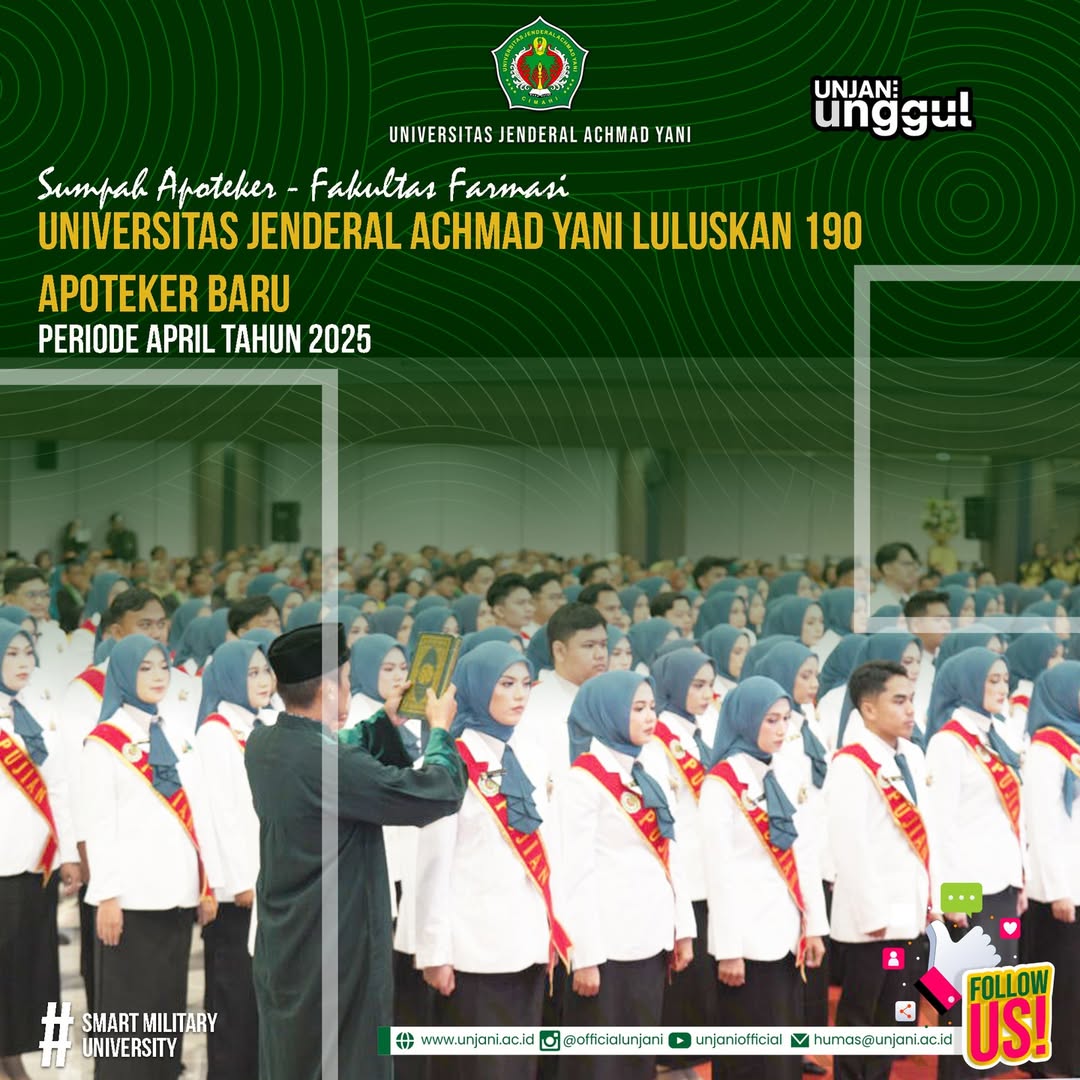 CIMAHI, KabarKampus – Universitas Jenderal Achmad Yani (UNJANI) kembali mencetak generasi unggul di bidang farmasi. Pada Rabu, 30 April 2025, sebanyak 190 lulusan Apoteker Baru dari Fakultas Farmasi resmi mengucapkan Sumpah/Janji Apoteker untuk Periode April 2025 Angkatan XXXVII. Upacara sakral ini dipimpin langsung oleh Dekan Fakultas Farmasi UNJANI, Dr. apt. Fahrauk Faramayuda, S.Si., M.Sc., selaku Ketua Senat Fakultas, dan berlangsung di Auditorium UNJANI.