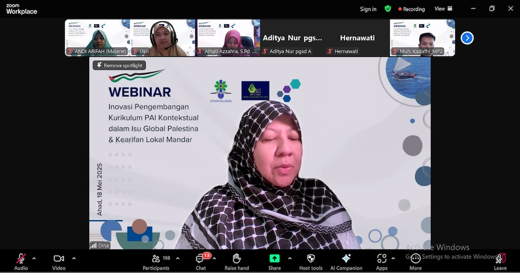 Webinar ini menghadirkan tiga narasumber utama: Dr. Hj. Syamsuduha, M.Pd. (Dosen Kurikulum PAI STAIN Majene), Dr. Dina Yulianti Sulaeman, M.Si. (Pakar Geopolitik Timur Tengah), serta Muhammad Syariat Tajuddin, S.H,. M.H. (Budayawan Mandar). Kegiatan dibuka secara resmi oleh Ketua STAIN Majene, Prof. Dr. Wasilah Sahabuddin, S.T., M.T., yang juga menyampaikan keynote speech dengan penekanan pada pentingnya pengembangan kurikulum PAI yang responsif terhadap nilai lokal Mandar dan isu global, seperti krisis kemanusiaan di Palestina.