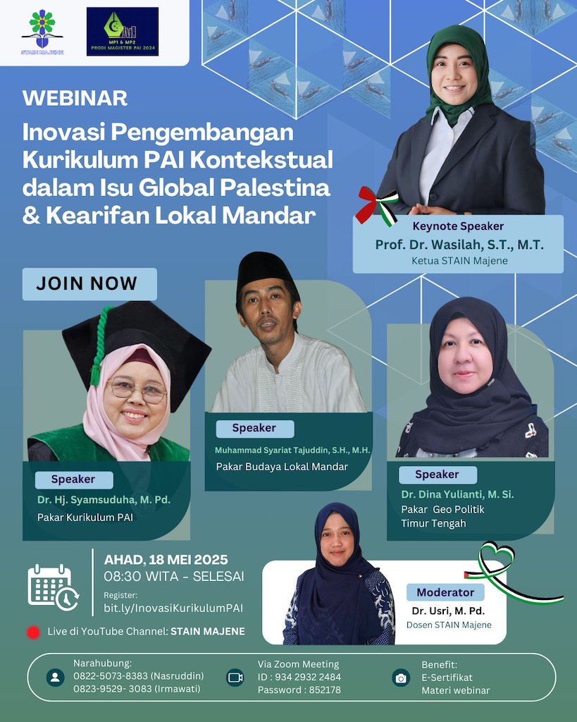 MAJENE, KabarKampus – Mahasiswa Program Studi Magister Pendidikan Agama Islam (PAI) Sekolah Tinggi Agama Islam Negeri (STAIN) Majene angkatan 2024 sukses menggelar webinar nasional bertema “Inovasi Pengembangan Kurikulum PAI Kontekstual dalam Isu Global Palestina dan Kearifan Lokal Mandar” pada Ahad, 18 Mei 2025 secara daring melalui platform Zoom. Kegiatan ini merupakan inisiasi dari mahasiswa yang tercetus di ruang perkuliahan Pengembangan Kurikulum PAI karena resah dengan krisis kemanusiaan di Palestina dan erosi budaya yang terjadi saat ini.