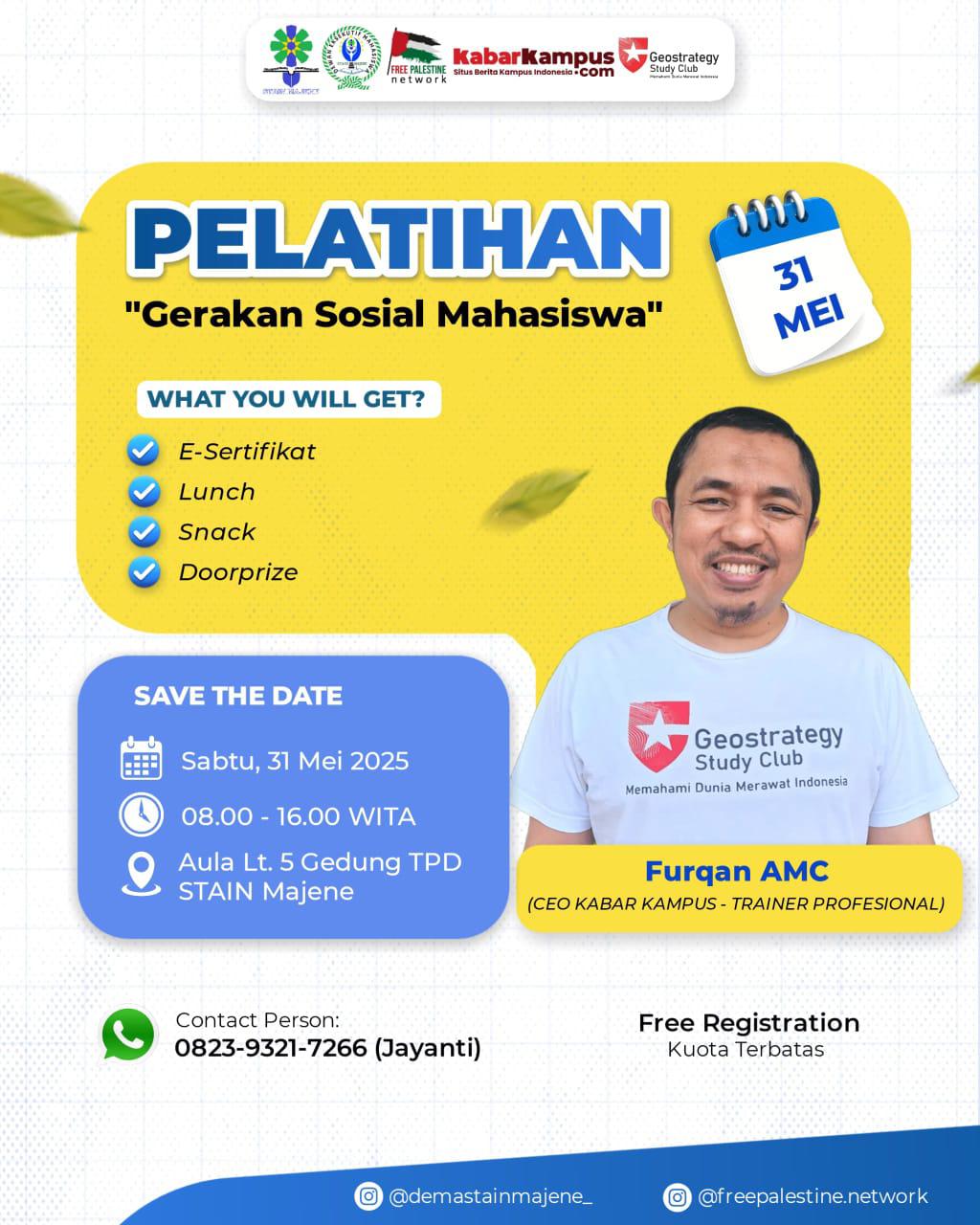 Free Palestine Network (FPN) POKJA MAJENE & POLMAN bekerjasama dengan DEMA STAIN MAJENE, mengadakan “Pelatihan Gerakan Sosial Mahasiswa” dengan menghadirkan CEO Kabar Kampus, Furqan AMC. Selain sebagai Sekjen Free Palestine Network (FPN), aktivis 98 ini juga dikenal sebagai Sekjen Geostrategy Study Club (GSC).